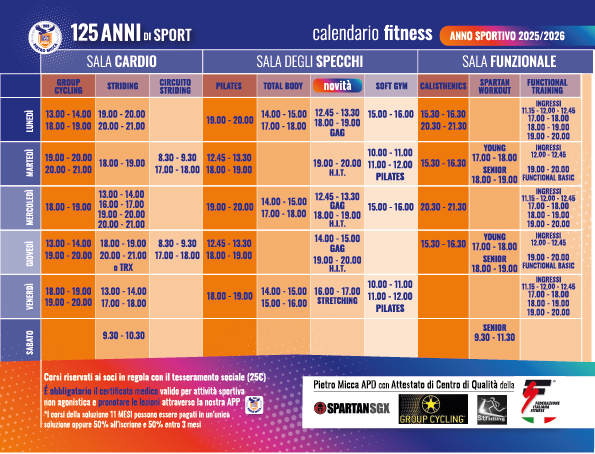 Con all’attivo oltre 600 iscritti, la Sezione Fitness è la tua palestra alla Pietro Micca! Tanti corsi tra cui scegliere in tanti orari diversi da mattino a sera, dal lunedì al venerdì sabato. Ogni corso ha 2 prove gratuite, dopodiché puoi iscriverti con la modalità “open” e seguire tutti i corsi che vuoi, sempre con un’unica tessera associativa un unico abbonamento. Ecco che cosa puoi trovare!